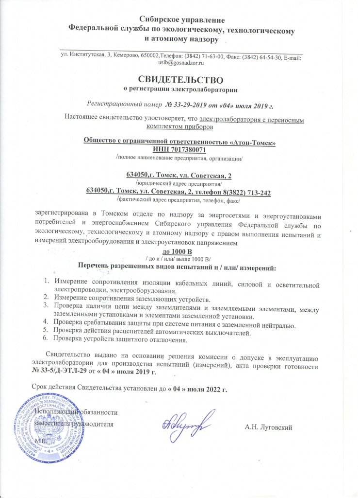 Электролаборатории «Атон - Нск», «Атон - Кузбасс», «Атон - Томск» зарегистрированы в Сибирском управлении Ростехнадзора с правом выполнения испытаний, измерений и проверок электрооборудования, электроустановок, электрических сетей.