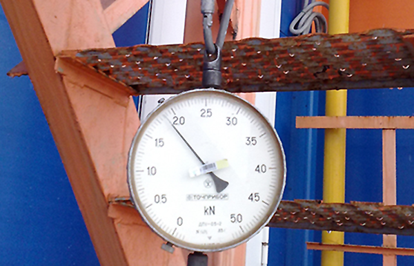 Ограждения в рамках проверки подвергаются и горизонтальным нагрузкам. Эти участки должны выдерживать до 50 кг. На них устанавливается лебедка, которая натягивает канат до определенного усилия, фиксируемого динамометром.